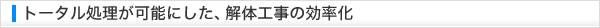廃棄物処理のエキスパートとしてのノウハウと技術を生かし、正確な分別解体を行います。解体によって出される産業廃棄物は、責任を持ち処理施設へ運搬。中間処理・最終処分の工程を経て、確実かつ安全に処理されます。解体工事も仙台環境開発に委託されることにより、廃棄物処理がより効率的になります。
